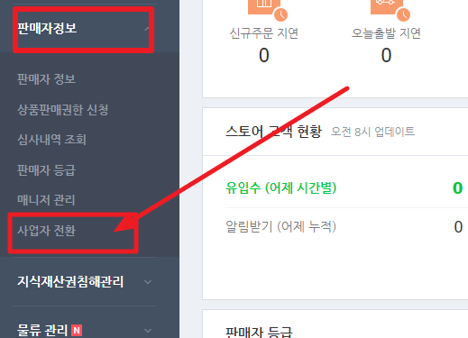 1. 스마트스토어 판매자센터에 로그인 후 왼쪽 "판매자 정보"에서 "사업자 전환"을 클릭한다.