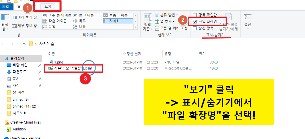 1-2. 파일 탐색기의 보기 부분에서 아래 순서대로 체크해줍니다.