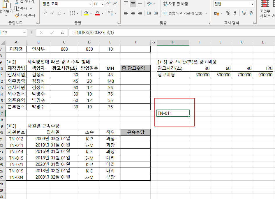 예를들어, 아래 엑셀에서 표3중 TN-011을 찾고자 한다면, 다음과 같이 진행하면 됩니다.